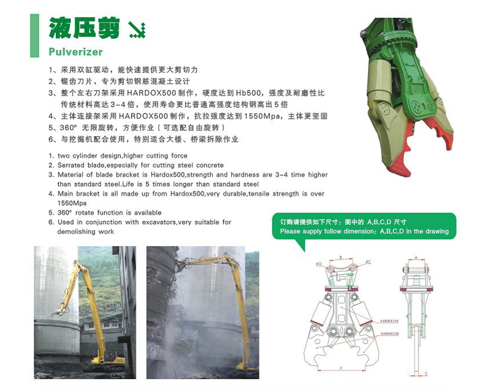产品特点:液压剪一般用于建筑物、汽车拆解,我司液压剪采用Hardox整体夹头,进口四面刀片设计,极大的提升了使用寿命,可选配自由旋转或液控旋转