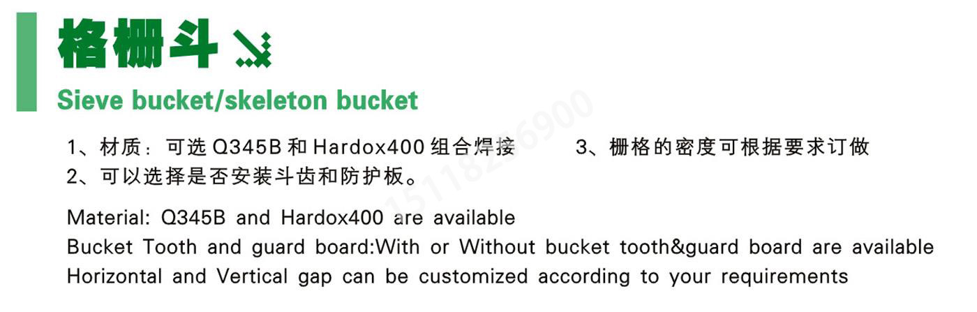 产品特点:栅格斗一般用于清理河渠、池塘里的污泥或垃圾。水都从栅格中流走,污物都留在栅格斗里面,这样就很方便地将水与污物分离开来