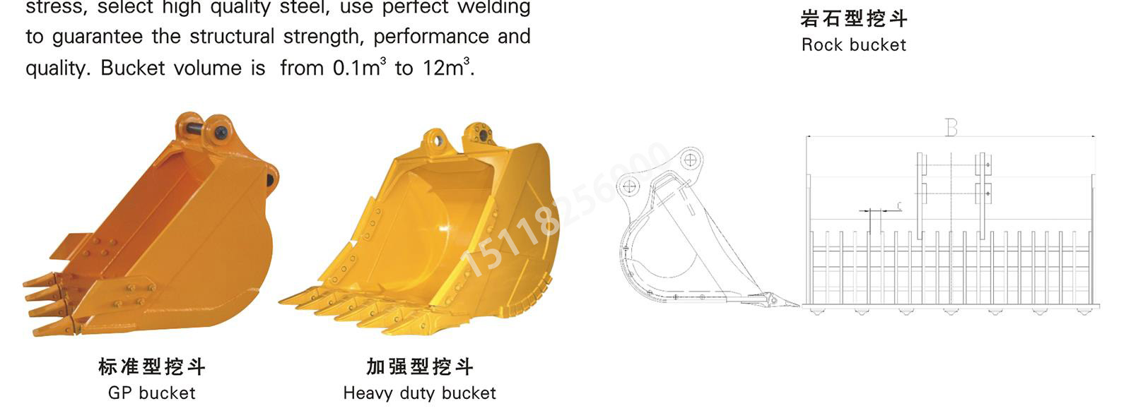 产品特点:挖斗的齿座板和侧刃板材料可以根据土方或挖掘混有较硬碎石的硬土、次坚石、风化石或坚石、爆破后的矿石的装载作业环境选用Q355、NM460或瑞典进口的超高强度耐磨钢HARDOX。