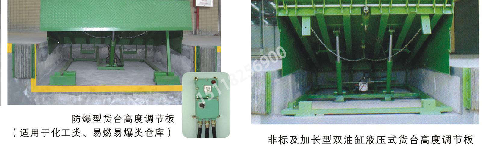 产品特点:防爆式货台高度调节板分为这几个部份防爆:电机防爆、电器防爆,电线阻燃,线管用1寸钢管攻好外牙与防爆软管对接,防爆等级达ⅡBT4级,一般应用于化工及易燃易爆企业